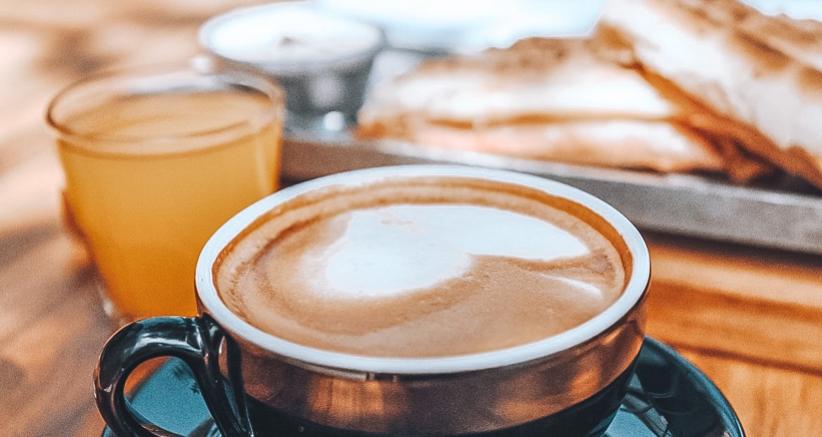 Infusión, con dos medialunas de la ostia, jugo de naranja chico