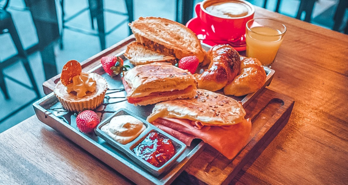 huevo revuelto, panceta, queso crema, dulce, jamón, queso, 2 tostadas, palta, café y jugo de naranja chico