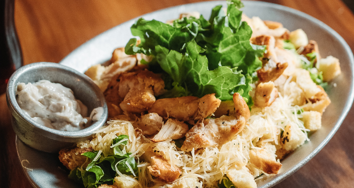 Colchón de verdes, bastones de pollo, croutones, escamas de queso parmesano. Acompañado de aderezo cesar.