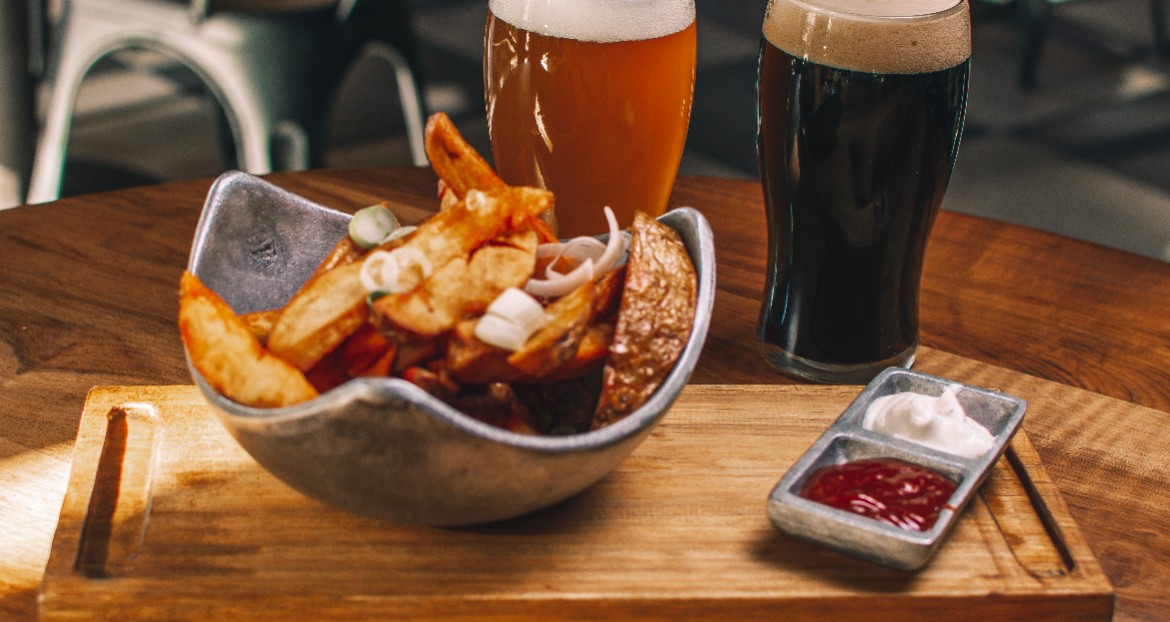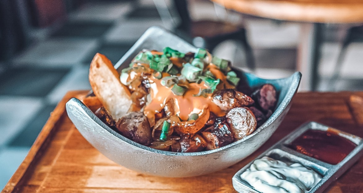 Papas de corte rustico con cáscara acompañadas de chorizo, cebolla caramelizada, queso cheddar y verdeo.