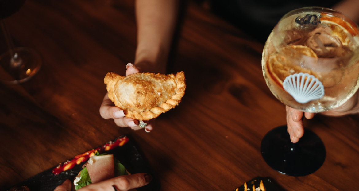 Empanada de carne de res cortada a cuchillo, con salteado de cebolla, pimientos y verdeo, en reducción de vino malbec.