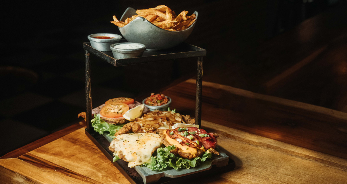 Torre de milanesas con diferentes topping, napolitana, 4 quesos, fugazzeta, cheddar y panceta. acompañada de papas fritas o puré y ensalada mixta.