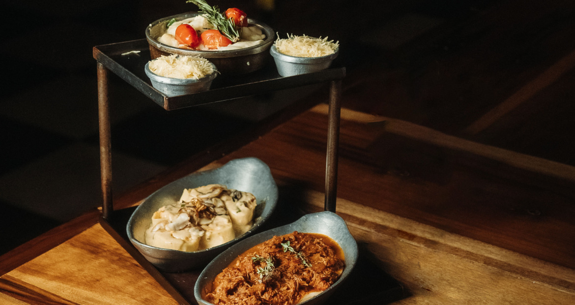 Torre con una variedad de pastas, sorrentinos de jamon y queso con salsa ragu, sorrentino de zapallo con una crema parmesano, y rotolos de zapallo y ricota con salsa de hongos.