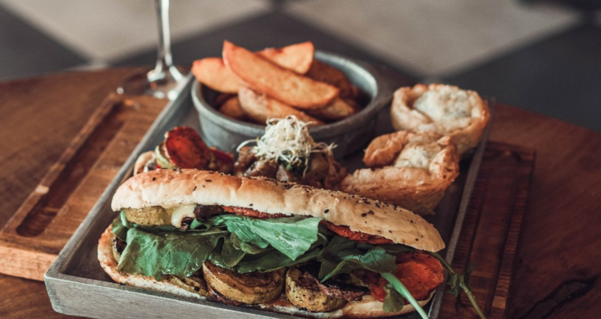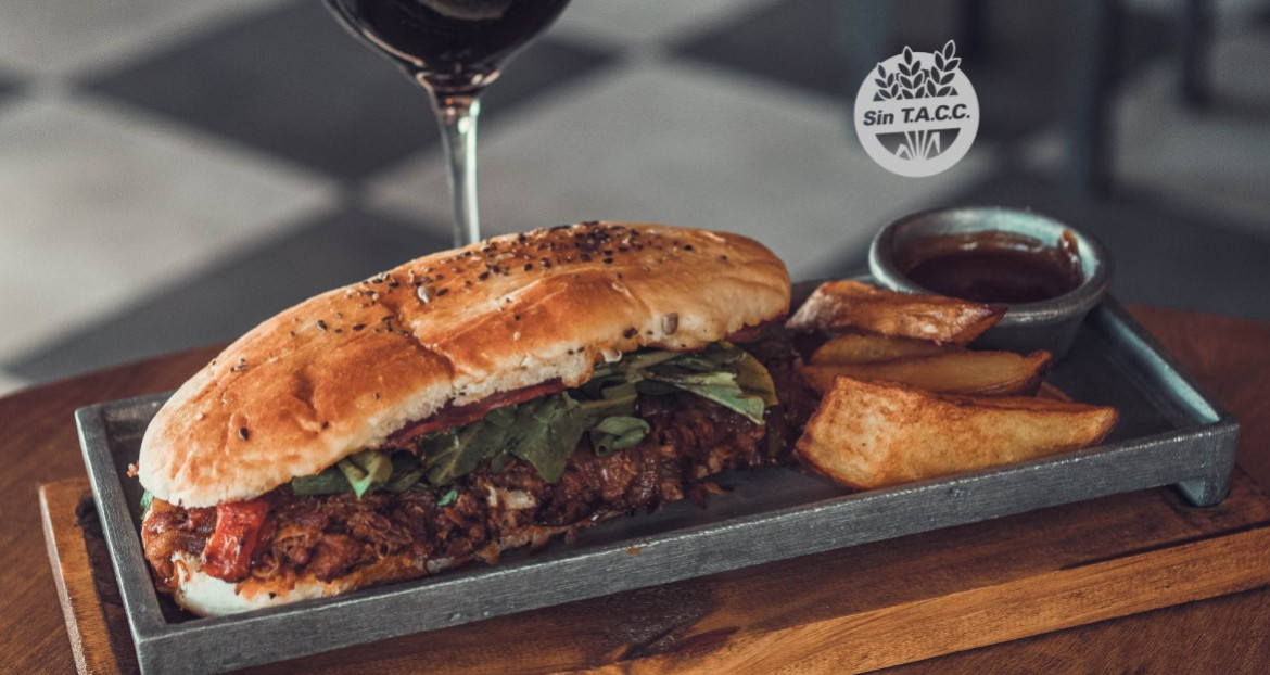 Pan casero con medallón de carne ahumada, mozzarella, rúcula, tomate, cebollas caramelizadas, champiñones, barbacoa y mayonesa casera. Papas rusticas fritas.