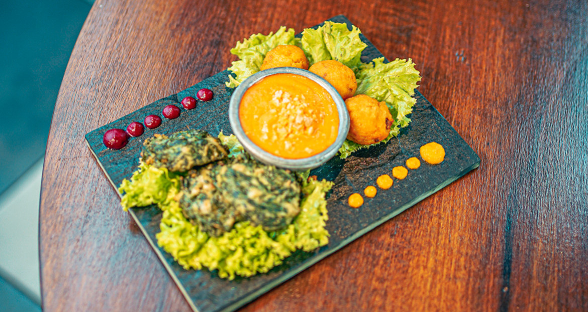 Buñuelos de espinaca y queso azul, con buñuelos de cabutia, acompañados de salsa de pimientos asados.